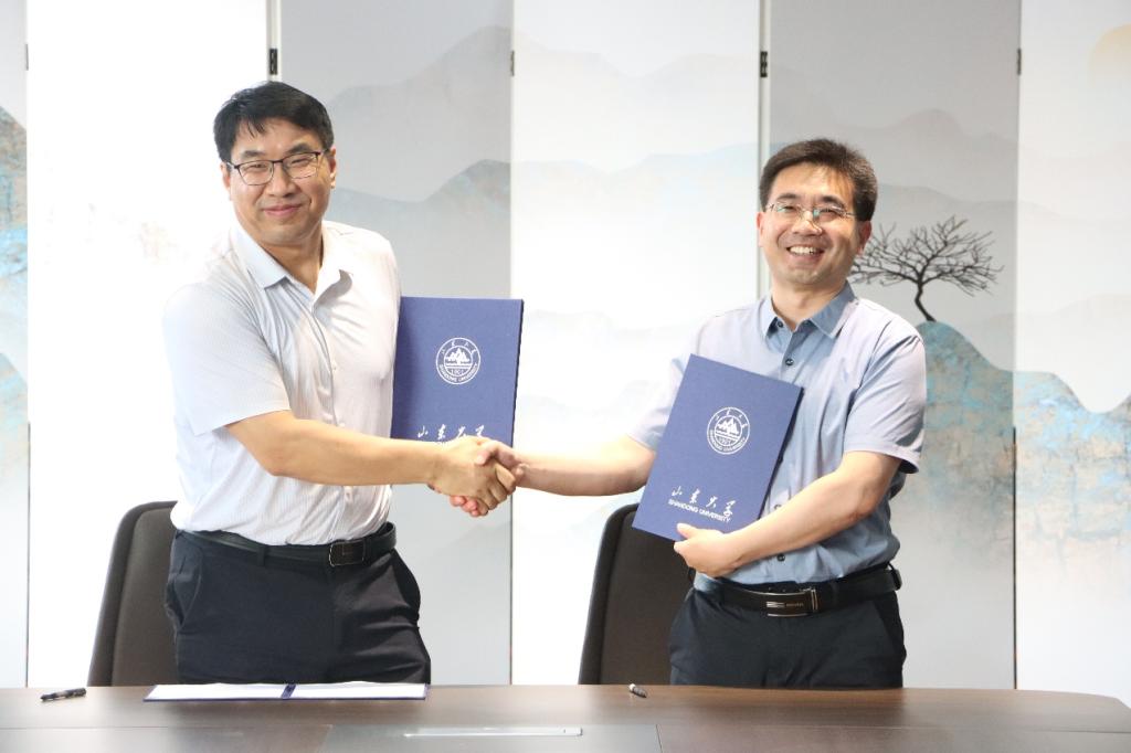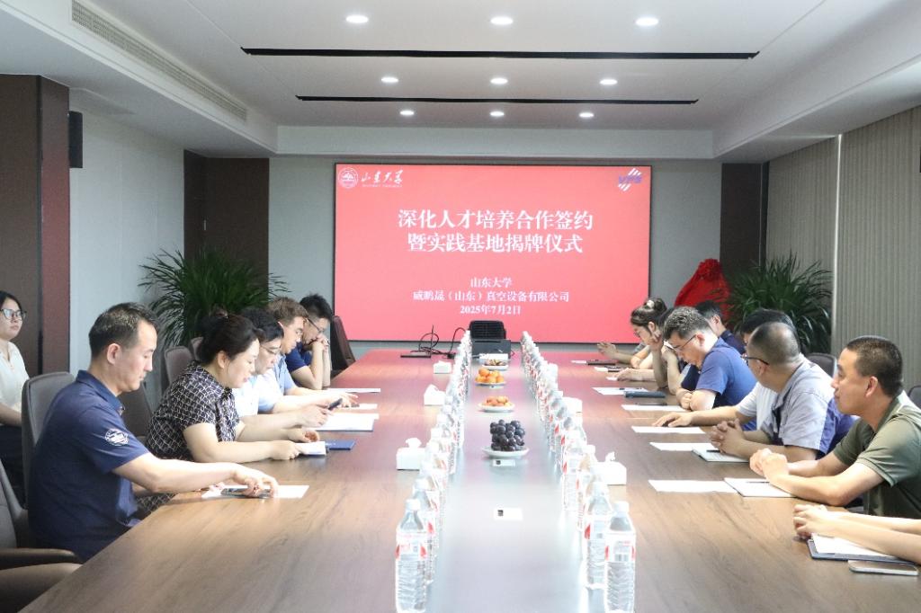梁奉军与杨仁彬代表双方签署《山东大学与威鹏晟(山东)真空设备有限公司共建“山东大学学生社会实践基地”协议书》,刘昌明与杨仁彬共同为基地揭牌。